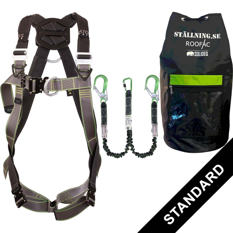 Ett komplett fallskyddspaket för ställningsarbete i vår standardserie. Alltsammans packat i vår praktiska väska med axelremmar.